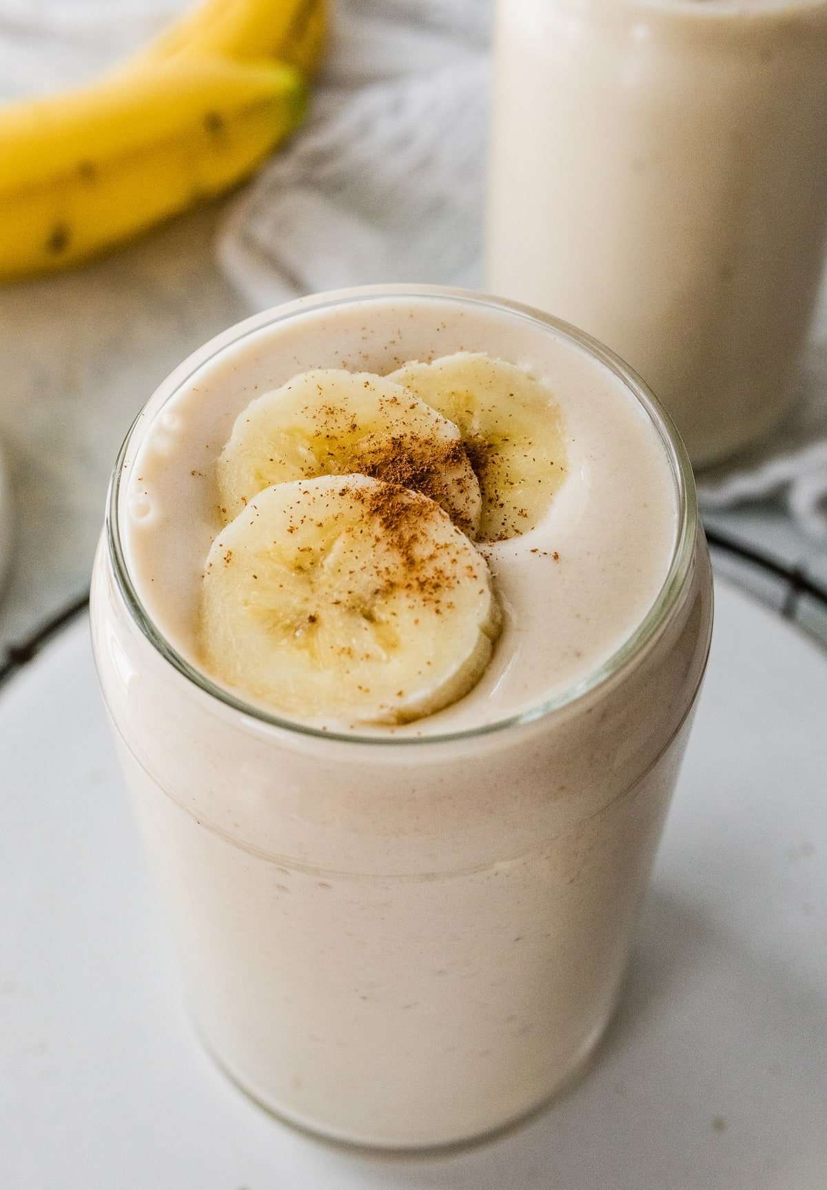 - Pour smoothie into a glass and top with fresh banana slices and a sprinkle of cinnamon. Enjoy!