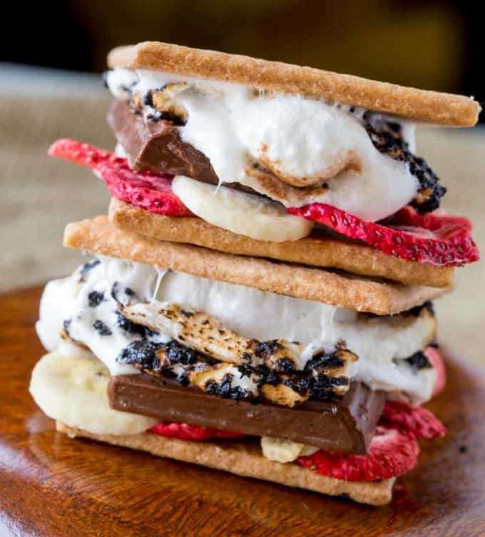 Banana Split S'mores with graham crackers, chocolate, marshmallows, freeze dried bananas and strawberries. A fun twist on the sticky, gooey summer classic!