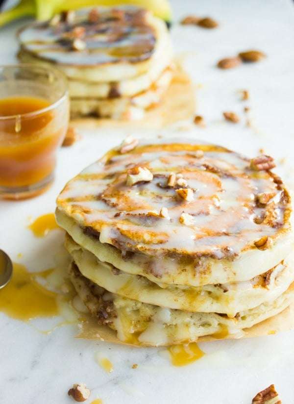 Tender fluffy pancakes with a swirl of cinnamon, pecans, banana and sugar — these Cinnamon Roll Pancakes are the perfect cross between cinnamon rolls, banana bread and pancakes! Drizzled with cream cheese icing and caramel sauce, this is a five star breakfast right at your fingertips!