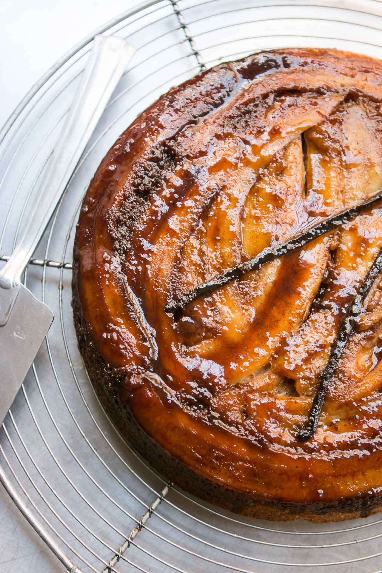 If you don't have a cast iron skillet, this can be made a standard 9-inch (23cm) cake pan (not a springform pan, which would leak during baking). Make the brown sugar topping in a regular skillet or pan, then pour it into a cake pan while it's still warm. Cut and lay the vanilla bean and bananas on top.