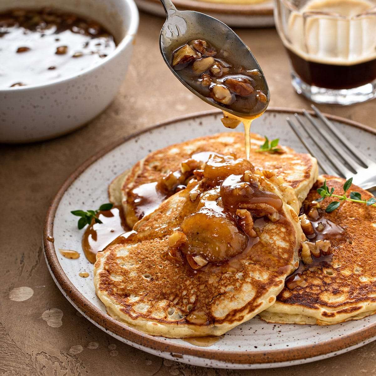 These homemade Bananas Foster Pancakes are fluffy inside, golden brown and crispy outside and are topped with caramelized bananas and crunchy pecans in a rich buttery, brown sugar and rum sauce. Rum extract can be used instead of dark rum.