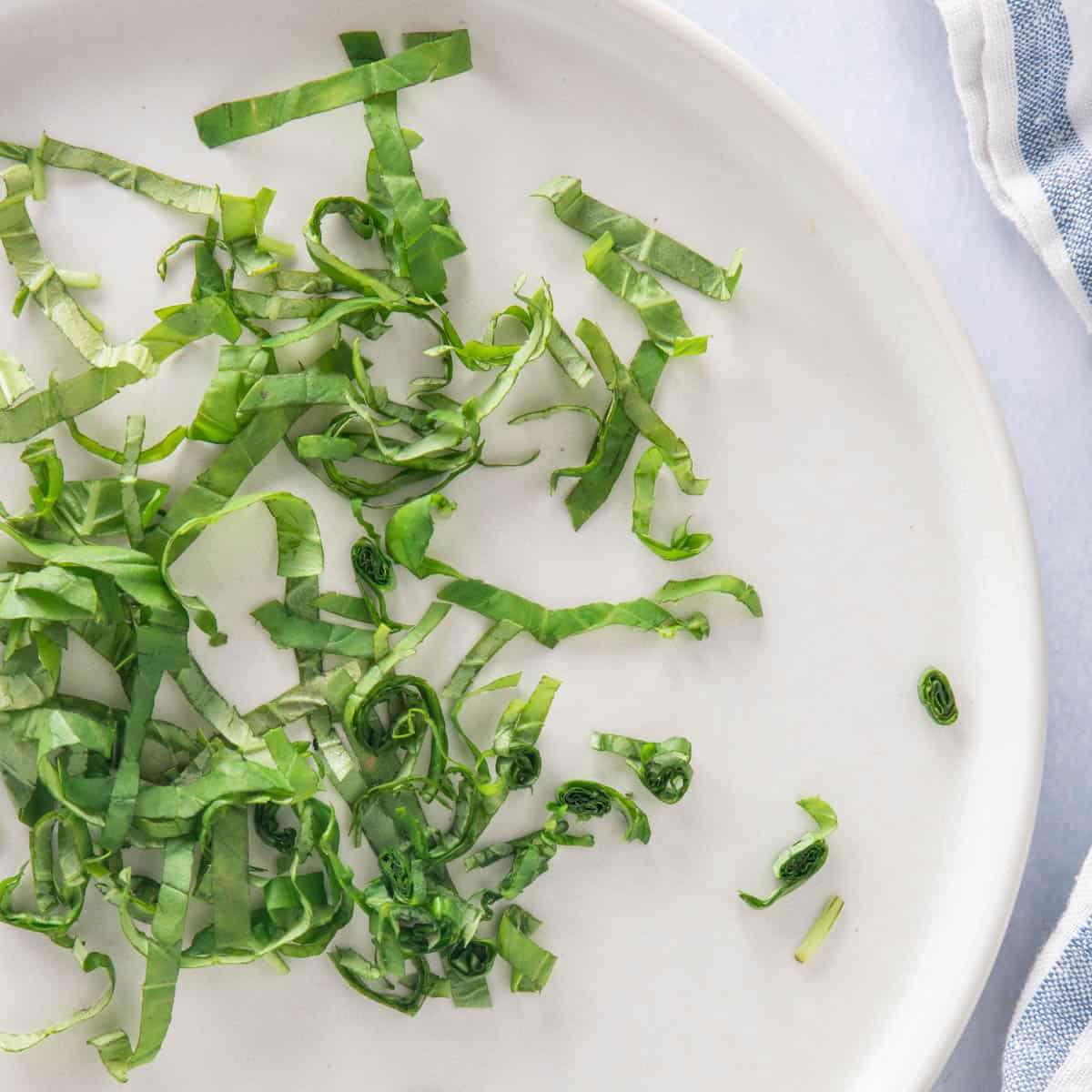 Easy basil chiffonade technique to cut your basil (and other leafy green vegetables and herbs) into delicious thin strips for maximum flavor!