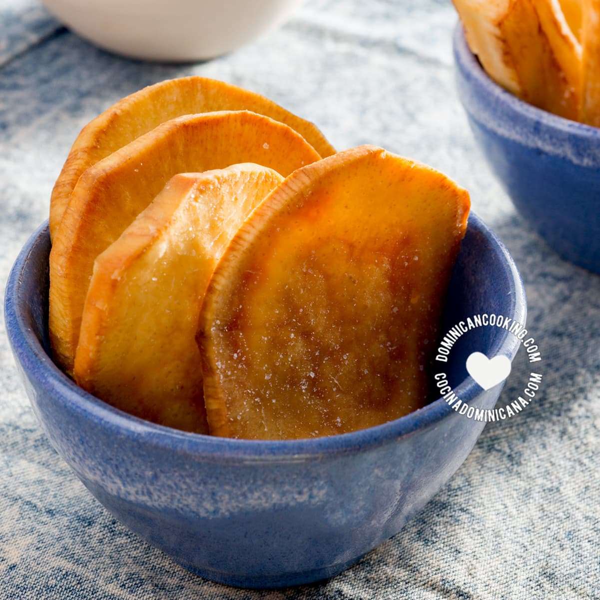 - Heat the oil over medium fire. Fry cassava or sweet potatoes until light golden (be careful with splatters). Rest on a paper towel to absorb excess oil.
