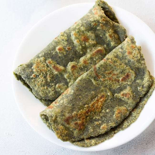 Bathua Paratha is a healthy Indian whole wheat flatbread made with bathua leaves, whole wheat flour (atta) and spices. Bathua is also known as Chenopodium Album, Melde, Lamb's Quarters, Goosefoot or Fat-Hen and is a common leafy green, especially used to make a variety of dishes in the North Indian cuisine repertoire.