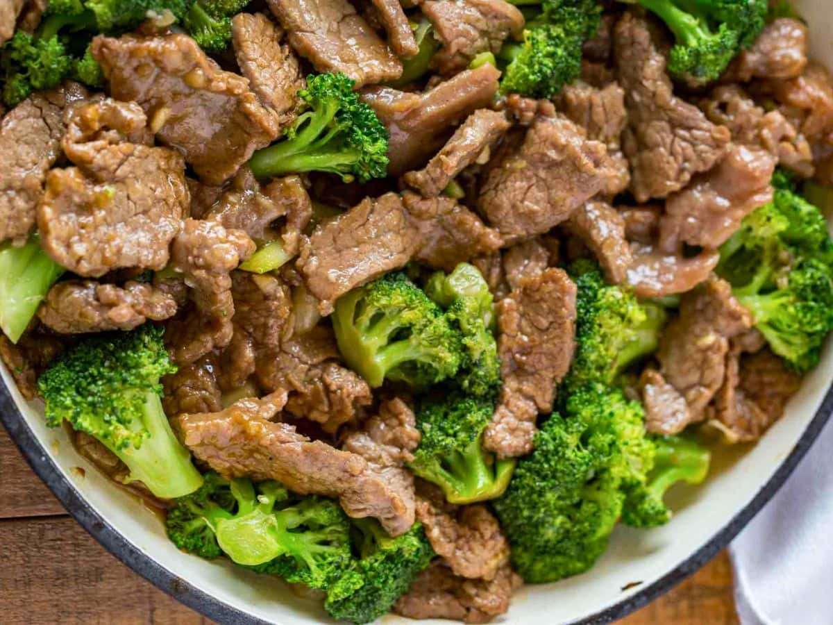 - Add in the garlic and ginger, stir and cook for 30 seconds and pour in the marinade and broccoli, cover and cook until the sauce thickens before adding the beef back in to coat with sauce.