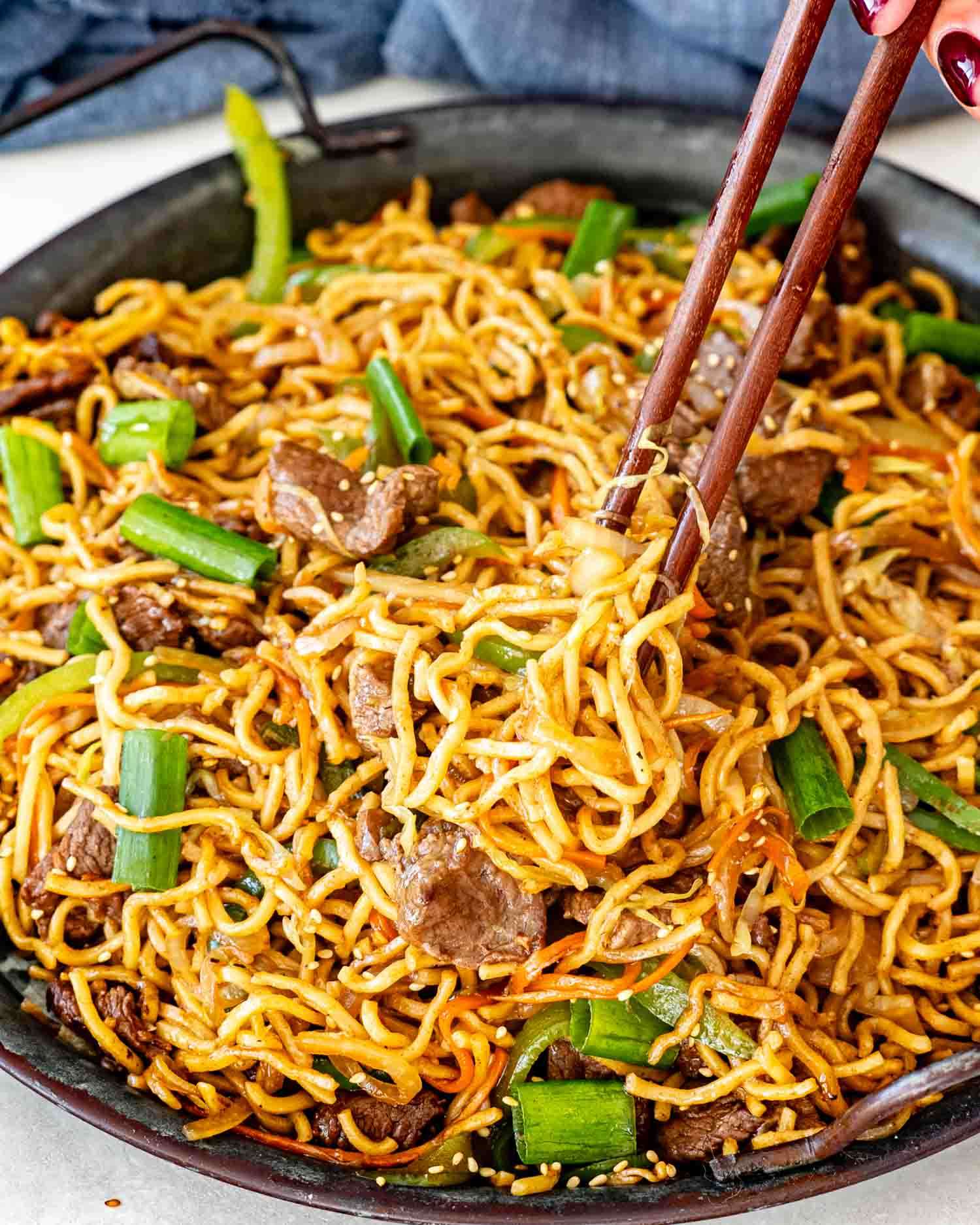 - Return the cooked beef to the wok with the vegetables. Add the cooked noodles and the sauce. Toss everything together over high heat until the noodles are heated through and have absorbed the sauce.