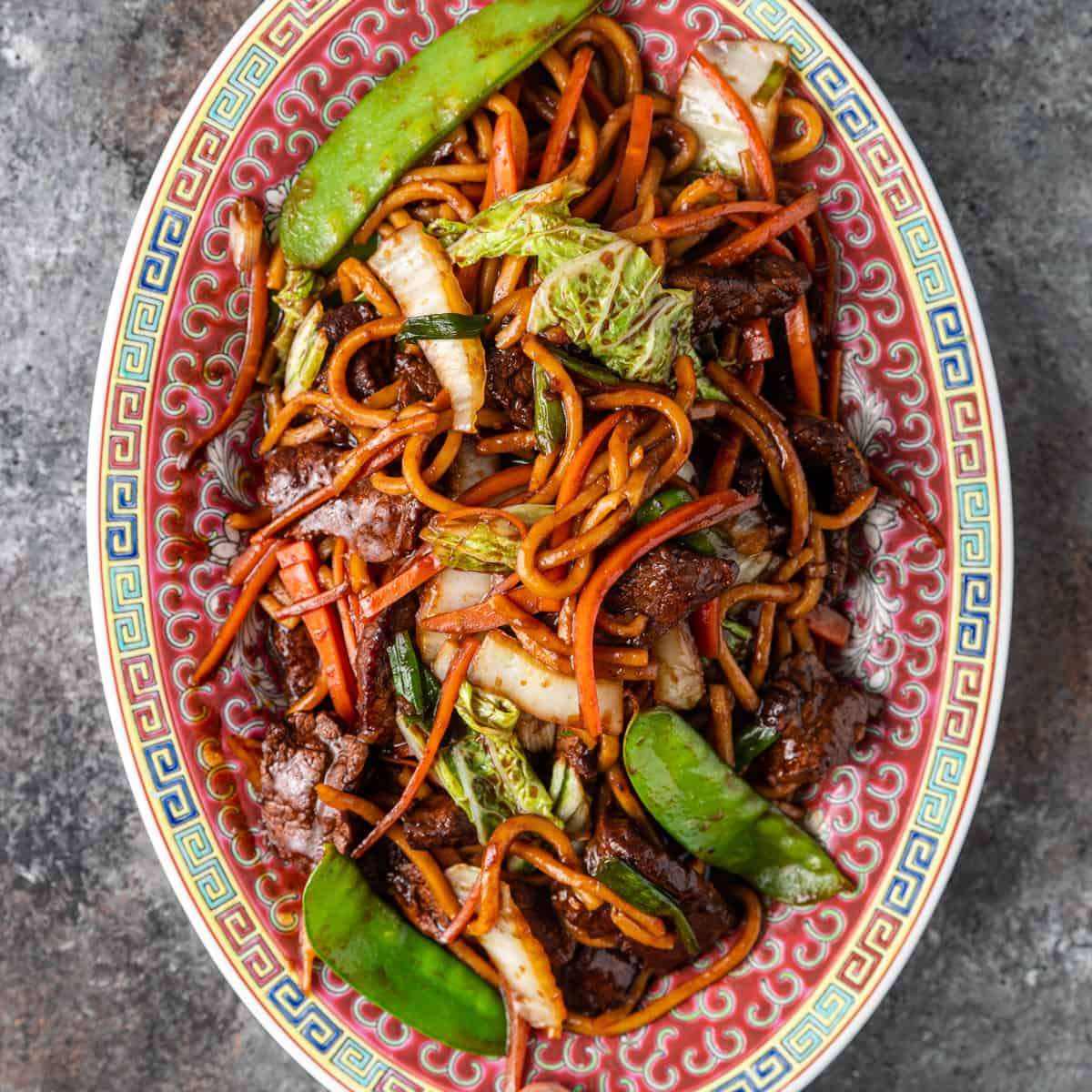 This beef lo mein features tender noodles, marinated steak, and crisp vegetables all tossed in a mouthwatering sweet and savory sauce.