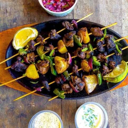 Mishkaki, or beef skewers in Tanzania, are served with vegetables and tamarind sauce.