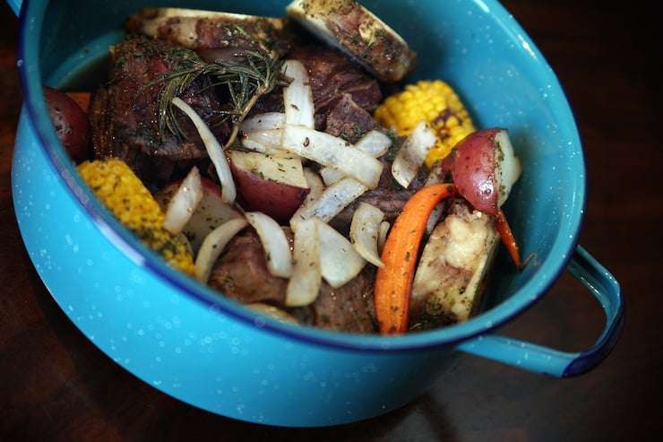 - Arrange all the ribs and bone marrow flat (optional) on a foil-lined roasting pan, casserole dish, or Dutch Oven. Pour olive oil and liquid smoke over the ribs. Surround with potatoes, carrots, and corn. Sprinkle the spices and rosemary sprig over the meat then add the onions over the meat.