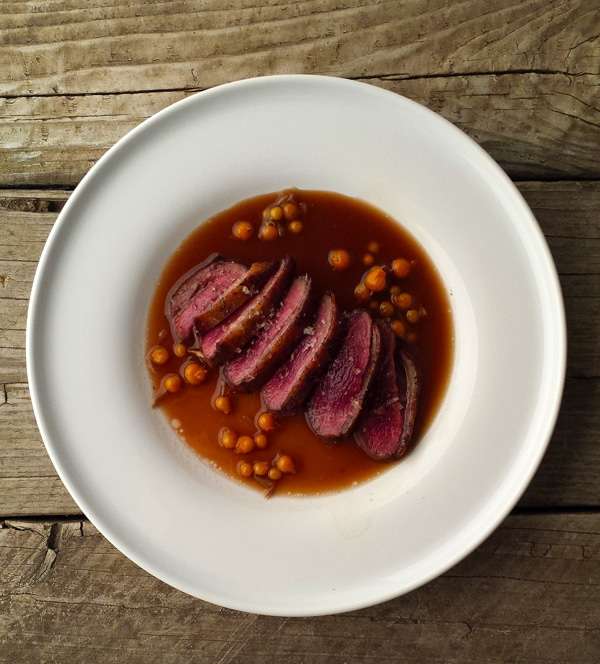 - To serve, slice the duck breast and salt it with the smoked salt. Pour some of the sauce down on the plate, top with the duck and toss a handful of berries on the plate. Serve with dark, crusty bread or with mashed root vegetables or potatoes.