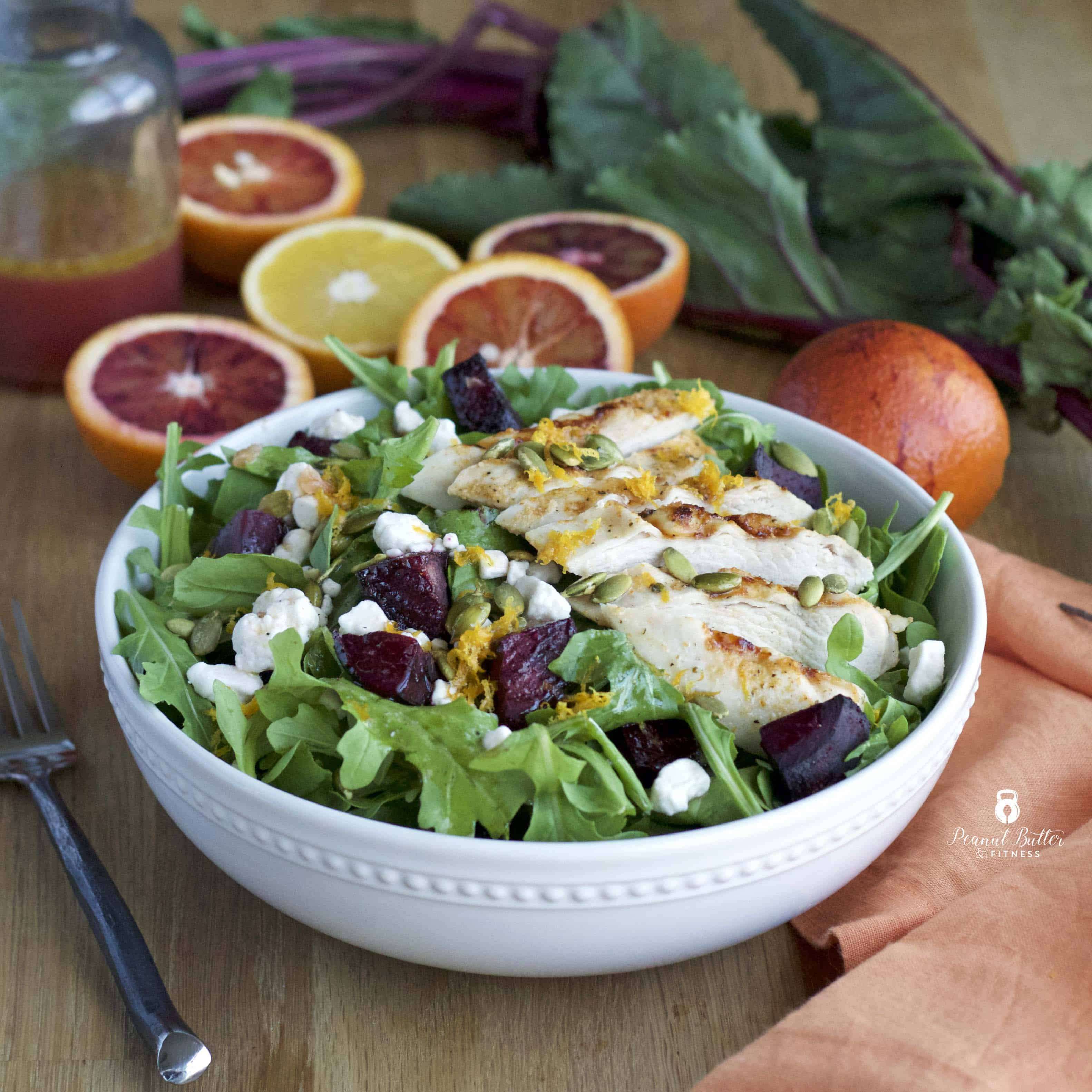 - Divide arugula, beets, chicken breast, pumpkin seeds, goat cheese, and orange zest evenly into 4 serving bowls. Top with dressing before serving.