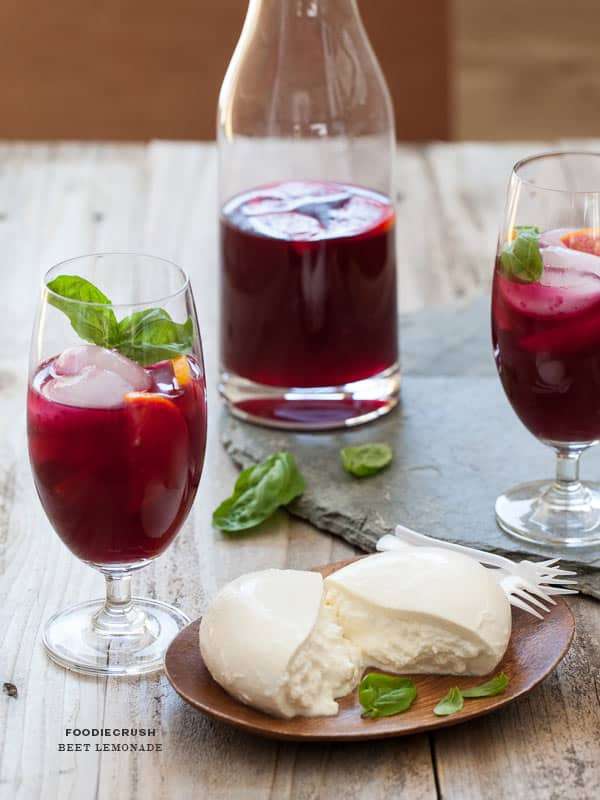 - In a pitcher, combine the simple syrup, lemon juice, beet juice, and remaining ½ cup of water. Stir to combine. Taste, and add more water if desired. Serve over ice and garnish with basil leaves.