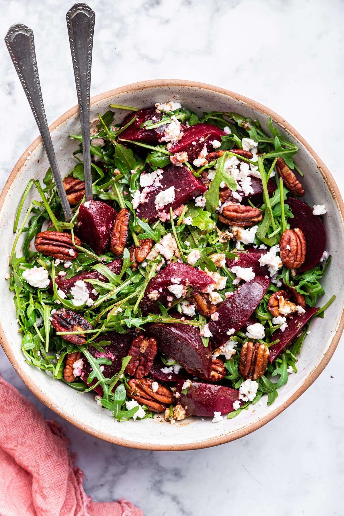 An easy beet salad with arugula, pecans, gorgonzola cheese and a simple balsamic vinaigrette. It's perfect as a side salad or topped with protein for a meal sized salad.