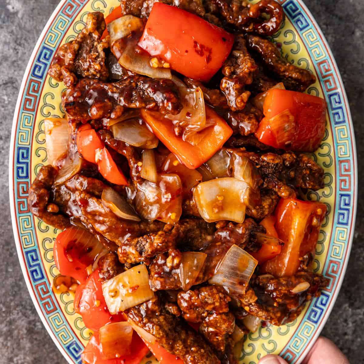 Crispy Beijing beef is marinated in spicy, savory Chinese spices and tossed in a sweet, spicy, sticky sauce with onions and bell peppers!