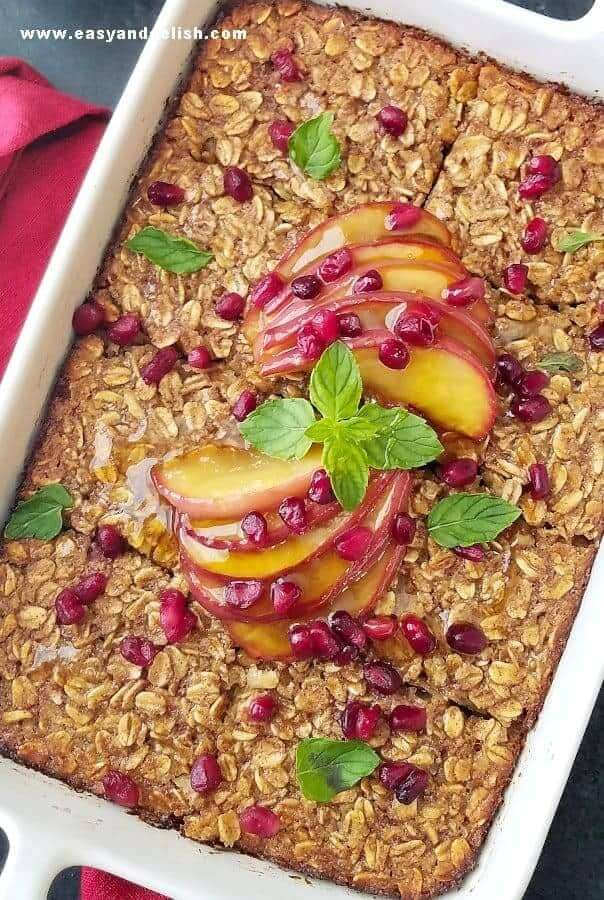 - Top apple baked oatmeal. If desired, garnish with pomegranate seeds.