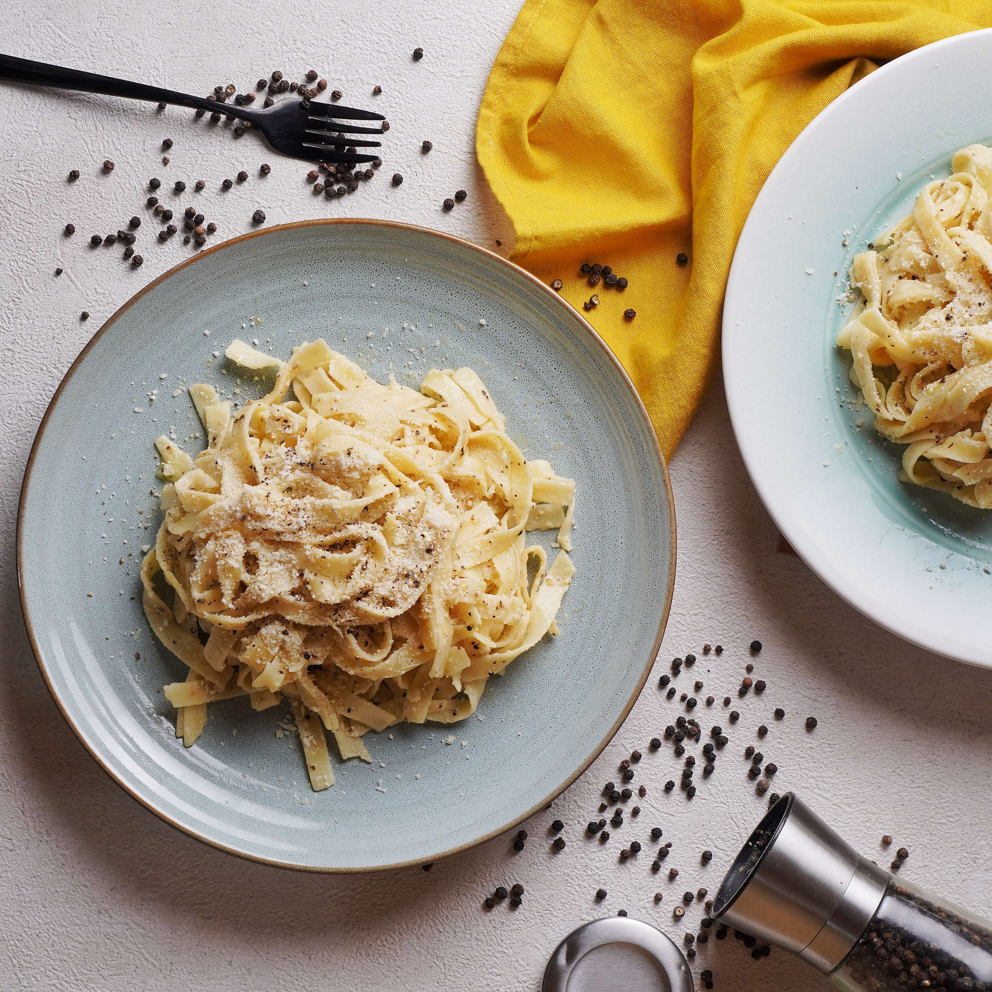 - Using tongs or a spider, remove the noodles from the pot into the sauté pan. Add the pepper and toss to coat everything with tongs or spoons. Add 1 or 2 more ladles of the pasta water and toss again.
