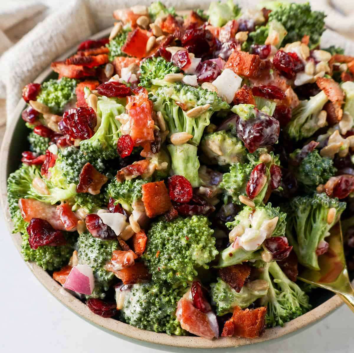 Crunchy, easy broccoli salad with crispy bacon, sweet dried cranberries, onion, and nuts all tossed in a sweet and tangy dressing. Tips for making the best broccoli salad. A classic potluck, BBQ, or summer side dish recipe!