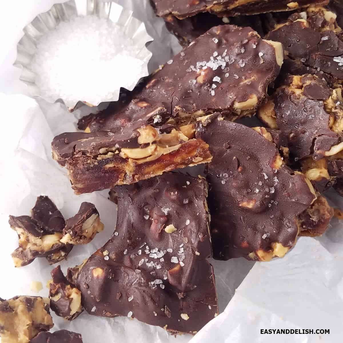 Viral TikTok Date Bark Recipe made in 10 minutes with 4 ingredients (Medjool dates, peanut butter, peanuts, and chocolate). It's the delicious homemade version of a healthy Snickers Bar, making a quick gluten-free and vegan meal prep for the week!