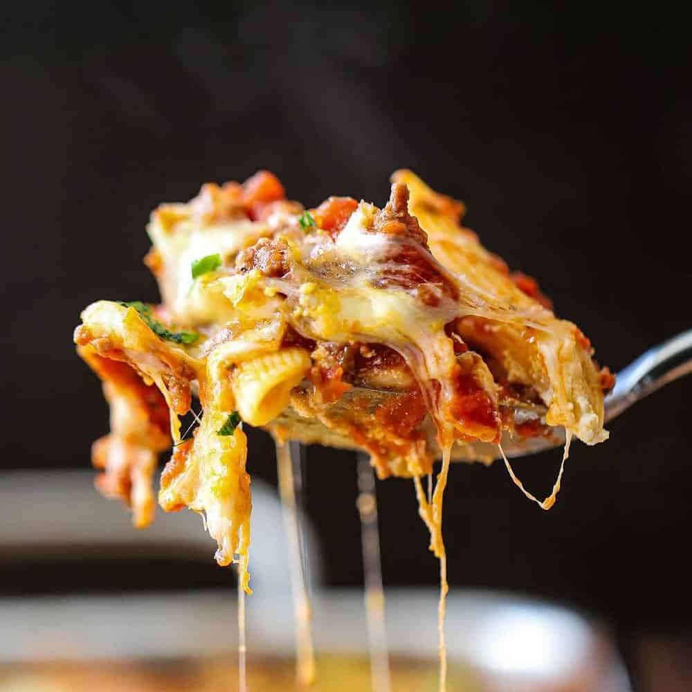 - Top with a handful of pasta, then another layer of the sauce, 1 cup of mozzarella, and another ¼ cup of Parmesan on top.