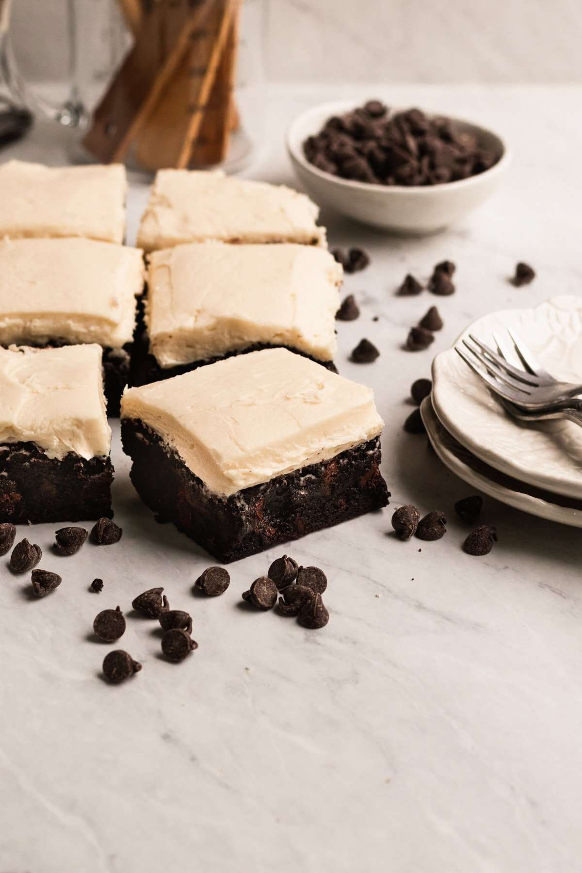 - Once fully incorporated, beat in the heavy cream on high speed for 2 minutes. Frost brownies once they have completely cooled. Cut into squares and enjoy!