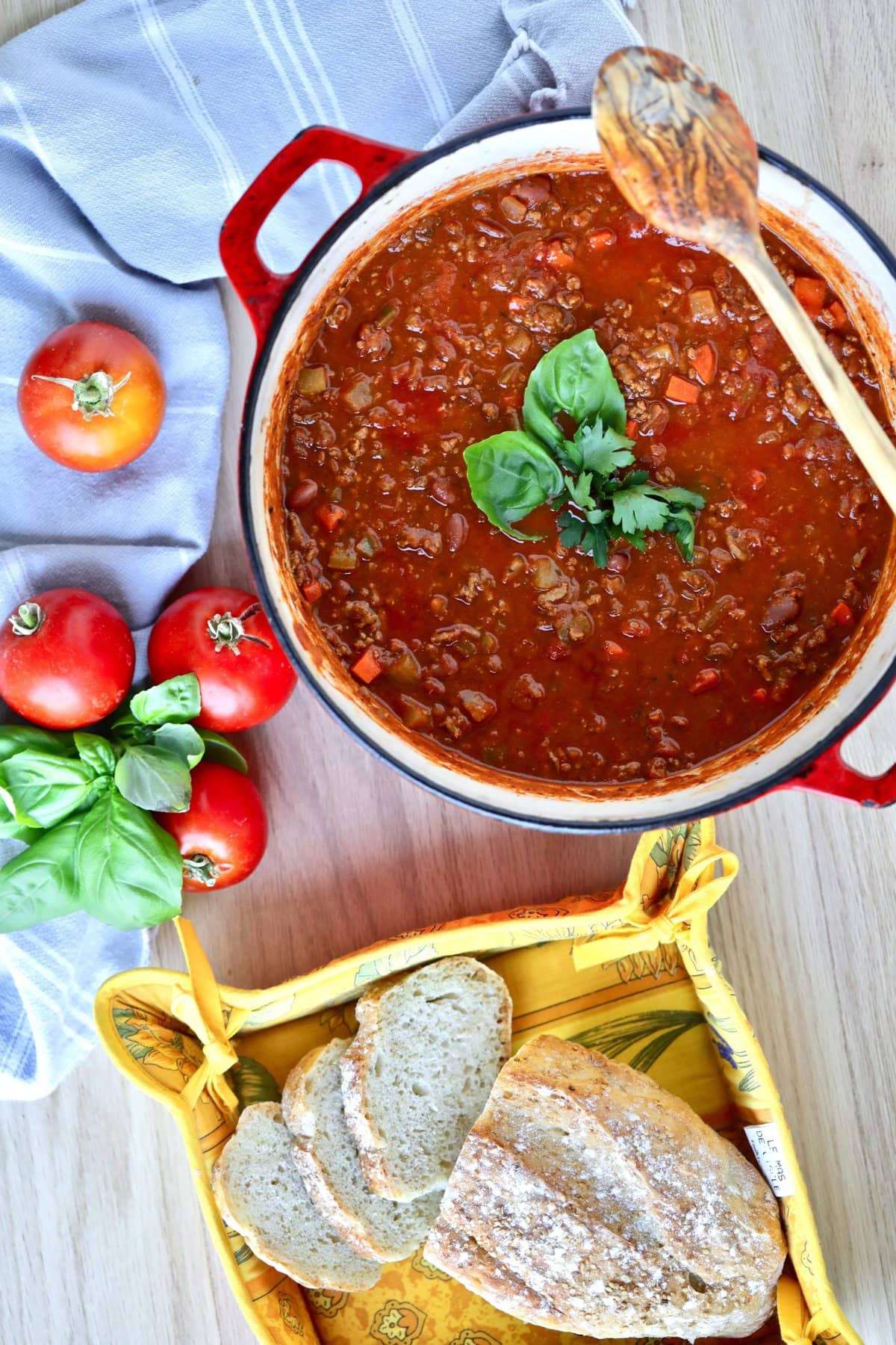 A delicious chili everyone will love! A little Italian flare to your standard chili recipe makes this dish irresistible. Serve to friends and family, or make a big batch and freeze for a rainy day. Enjoy with my recipe for the softest No Knead Bread.
