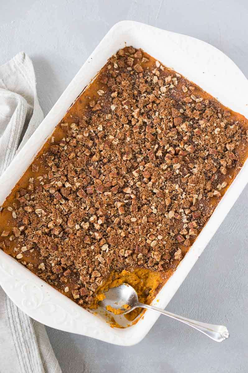 A healthier sweet potato casserole topped with sweet & delicious crunchy pecan topping. Perfect for Fall and Thanksgiving!