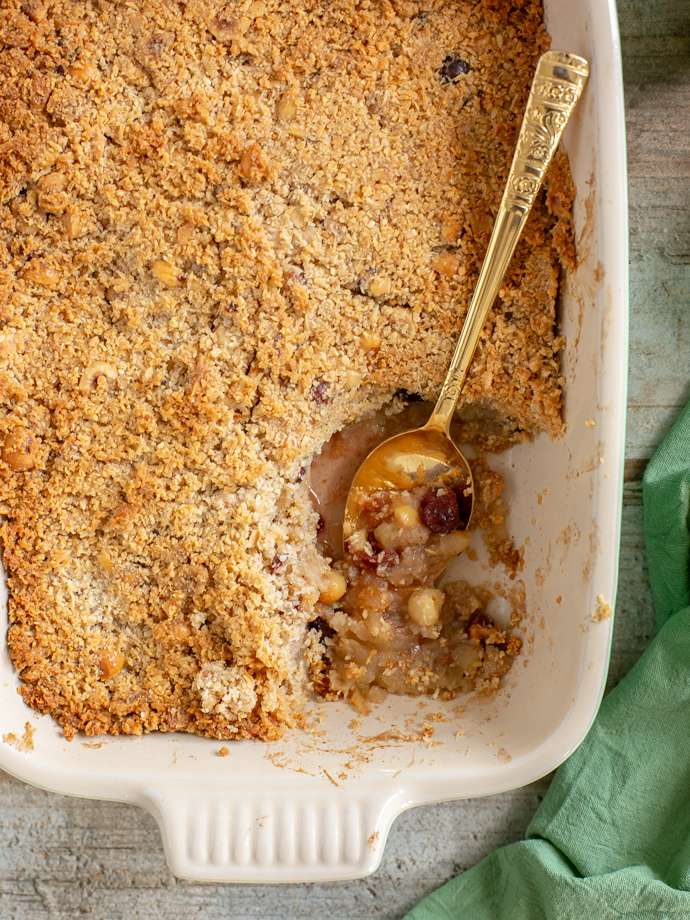The best vegan apple crumble recipe! Deliciously warm spiced apple filling meets crunchy nutty gluten-free topping for a perfect bake!