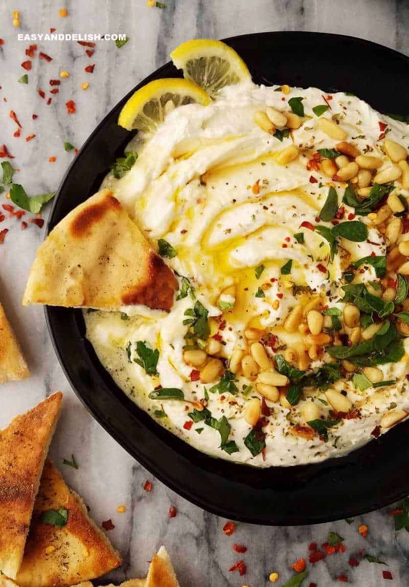 Whipped feta dip is a creamy Mediterranean appetizer that takes just 5 minutes to make. It’s a salty, garlicky, nutty, mildly sweet, sour, and spicy dip that is addicting! Serve with pita chips or crostini for sports games and parties, or as a healthy snack.