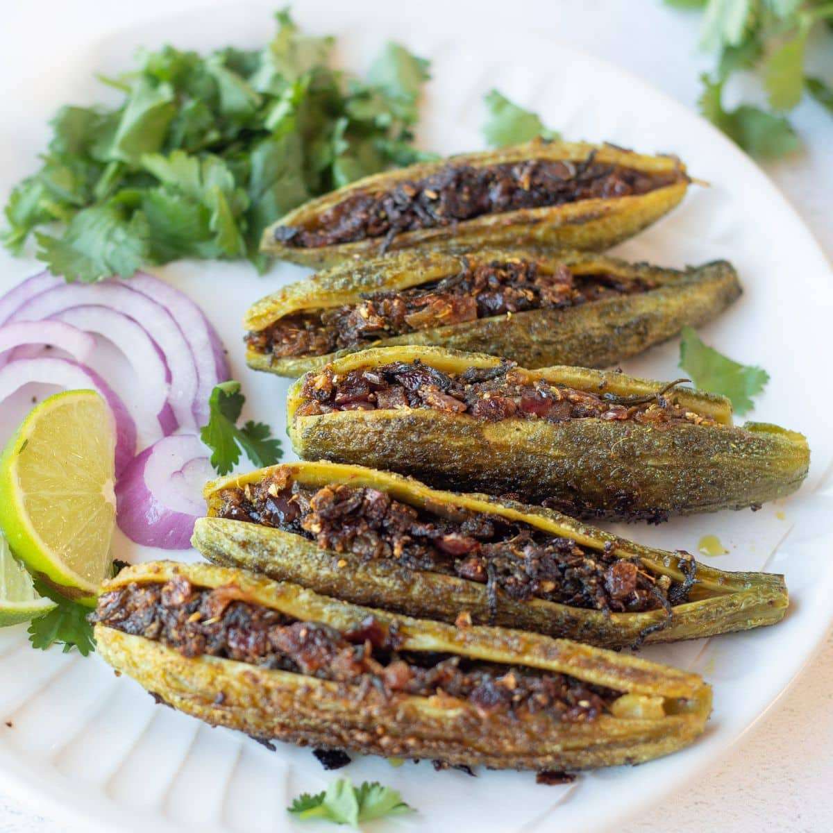 A delicious stuffed bitter gourd recipe popular in North India. Bitter melon is stuffed with caramelized sweet onions and aromatic spices to make this fantastic vegan and gluten-free side dish.
