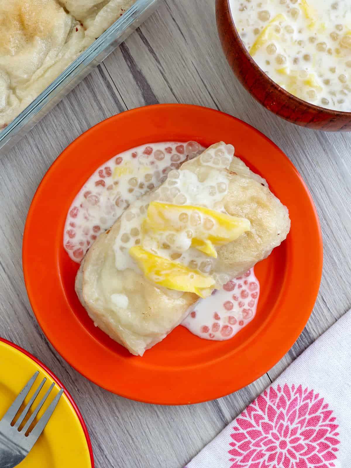 - To serve, place baked bibingkoy on a plate and spoon ginataan sauce on top.