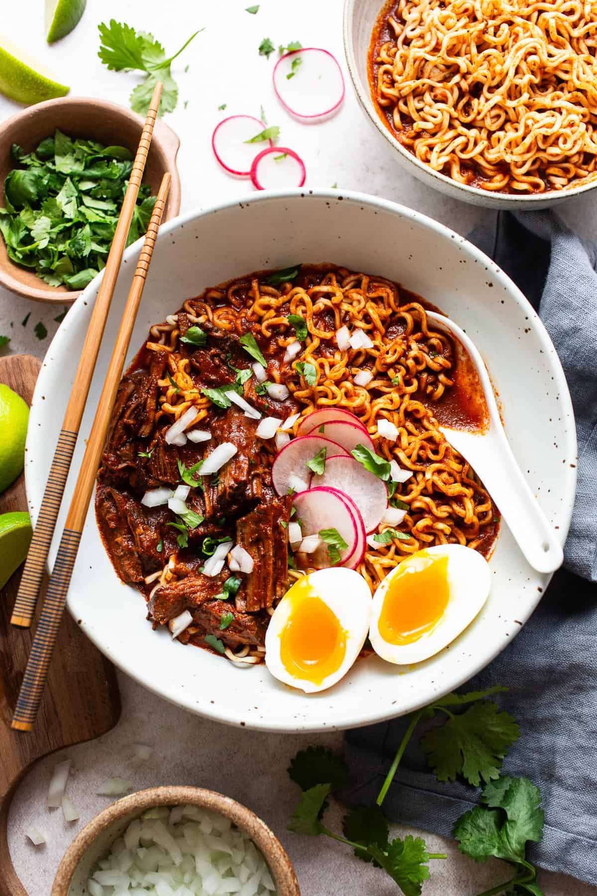 Birria ramen made with rich and flavorful birria broth and tender shredded birria meat paired with warm, slurp-worthy noodles. Just the best!