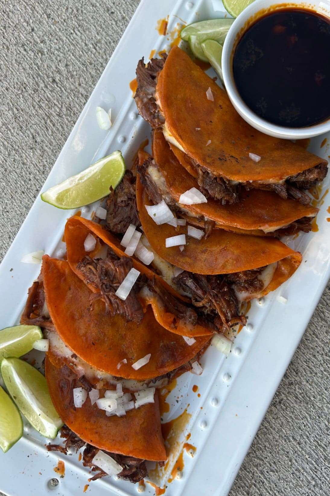 - Top birria tacos with reserved white onion. Ladle warm beef consommè into a bowl to be used as a dipping sauce. Serve tacos on the side with lime wedges.