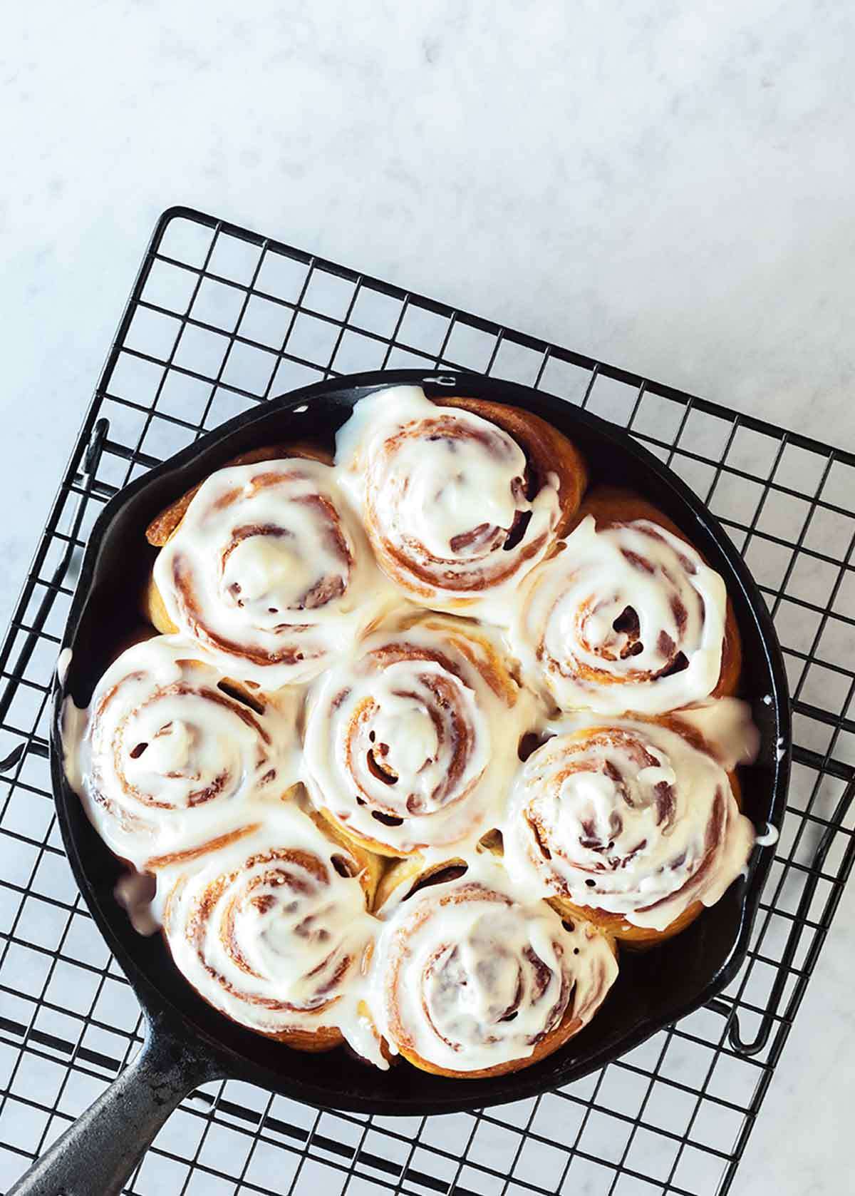 - Transfer the skillet or pan to a wire rack. Let the rolls cool for about 5 minutes before icing. If desired, you can use an offset metal spatula to loosen the buns from the skillet or pan and, wearing oven mitts, place a large plate over the pan and invert the rolls onto the plate. Place the cooling rack on the plate and invert the rolls onto the rack.