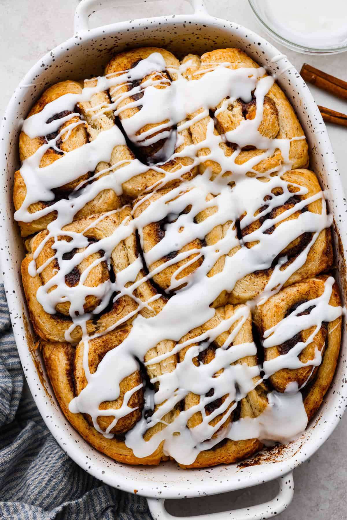 - Once the cinnamon rolls have cooled for 5-10 minutes, drizzle the glaze on top and serve.