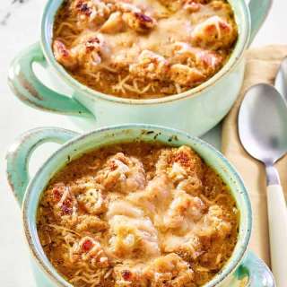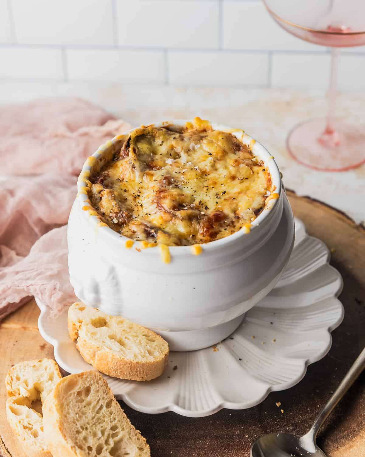 Make this gourmet Bistro French Onion Soup recipe like Panera Bread with caramelized onions, rich beefy broth, and crisp baguette covered in Gruyere cheese.