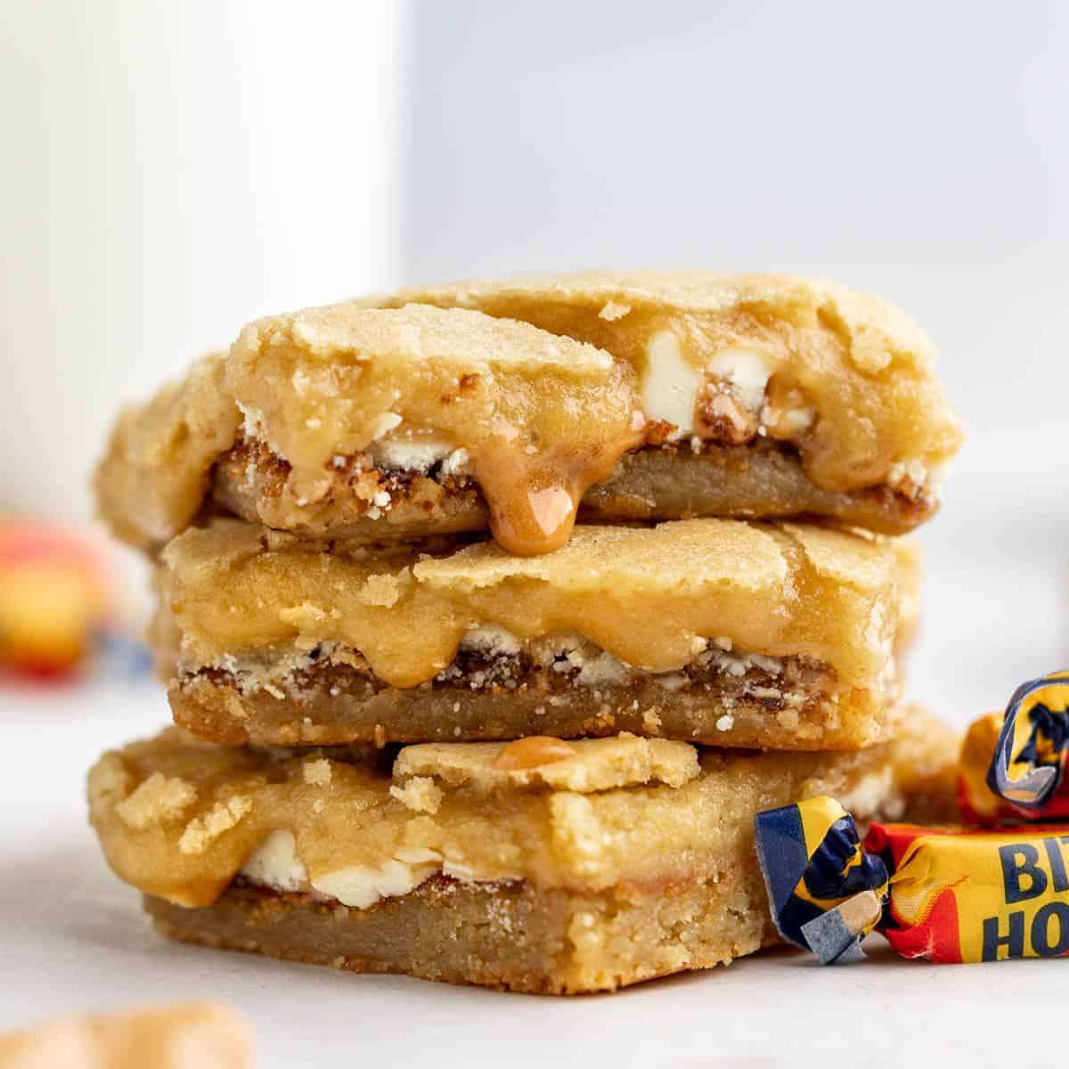 Homemade Bit-O-Honey blondies are the caramel-centered dessert you didn't know you needed. Simple to make, incredibly delicious, and a definite crowd-pleaser.