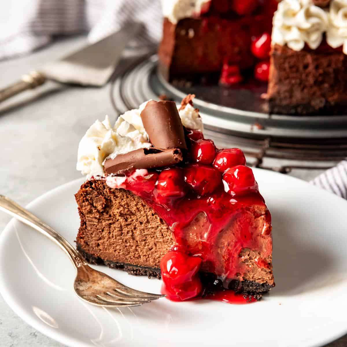 Indulge in a decadent Black Forest Cheesecake with creamy chocolate filling, a rich Oreo crust, luscious cherry topping, whipped cream, and chocolate curls—perfect for any special occasion!