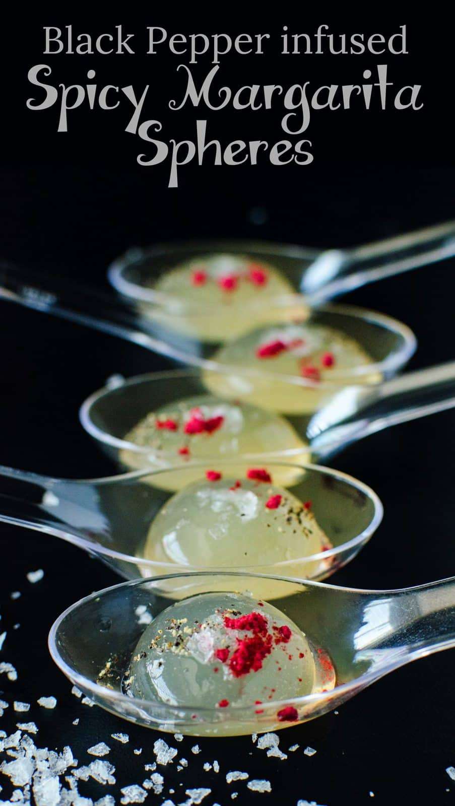 These Spicy Margarita Spheres burst in your mouth and flood it with all the wonderful flavors of a tequila shot - sweet, sour, and a hint of salt, followed by the slight heat & spice of black pepper!