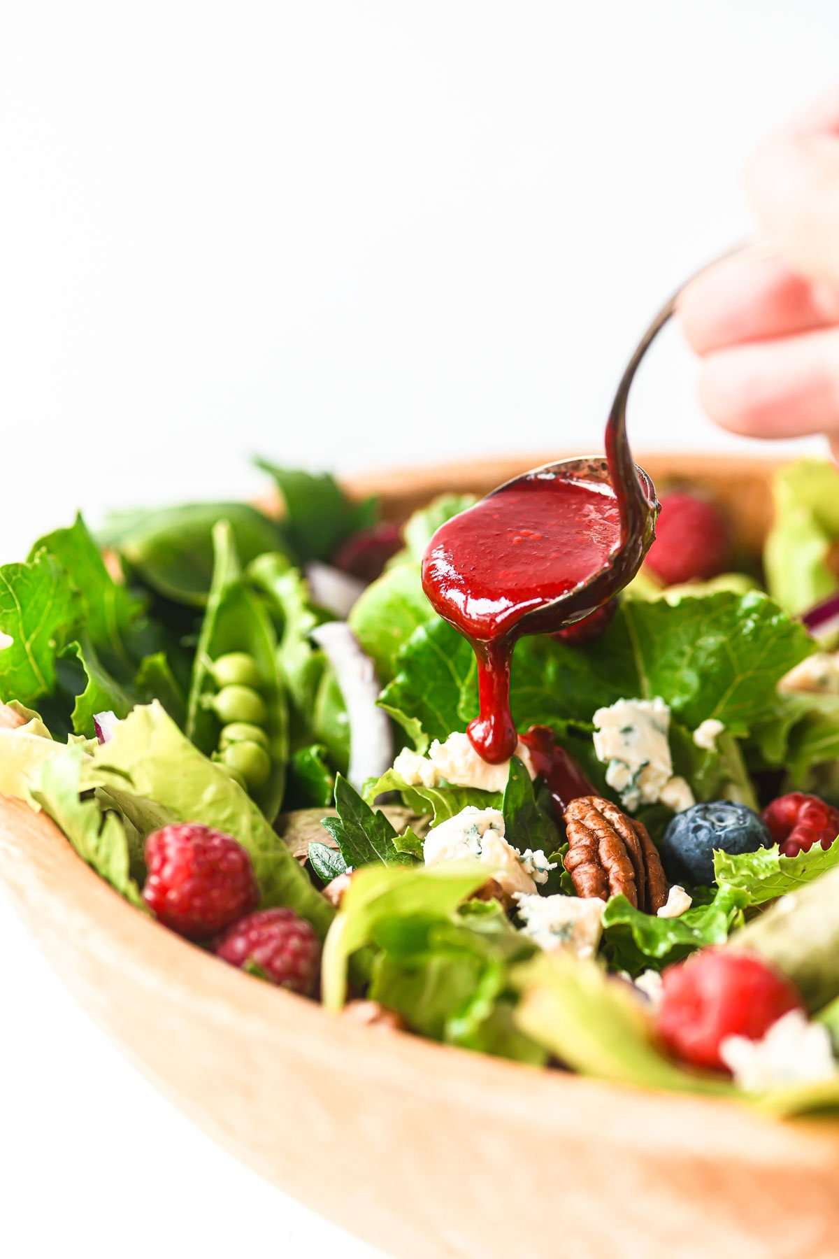 I make a vibrant black raspberry vinaigrette using fresh-picked summer berries. It adds a healthy burst of color and flavor to your salads.
