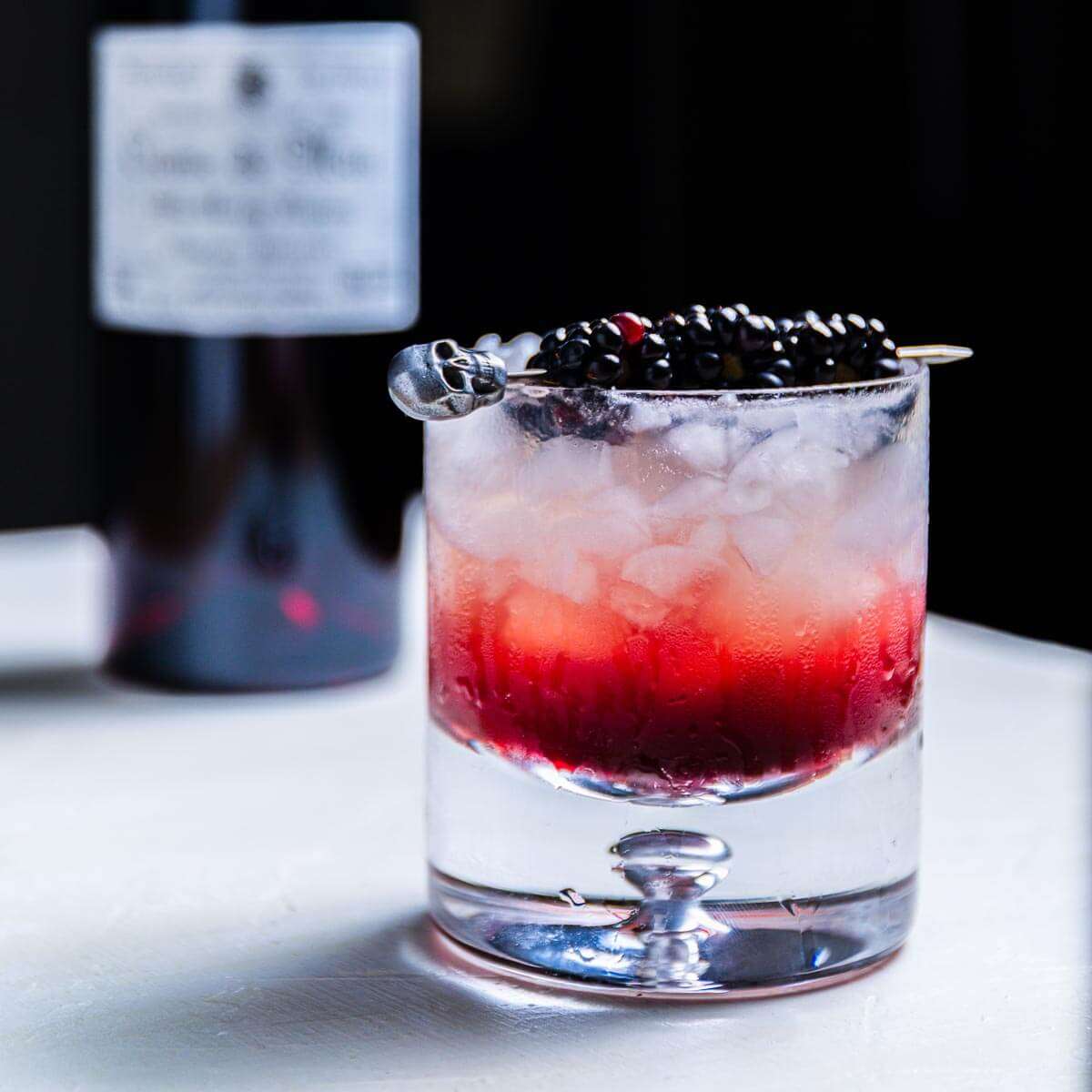 - Drizzle the crème de mûre over the back of a bar spoon to achieve a marbled effect.