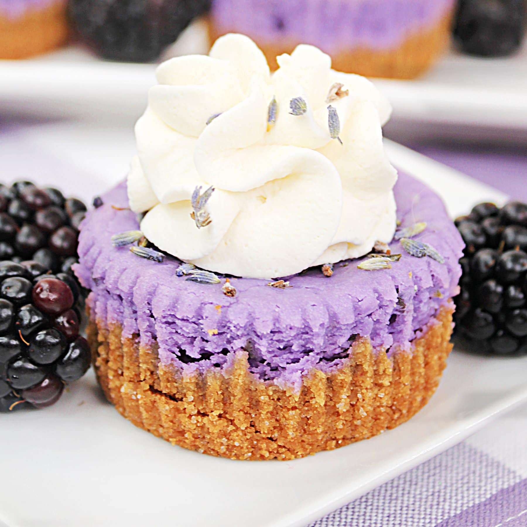 These Blackberry Lavender Cheesecakes Bites have a creamy blackberry lavender filling on top of a vanilla wafer crust and topped with homemade whipped cream.