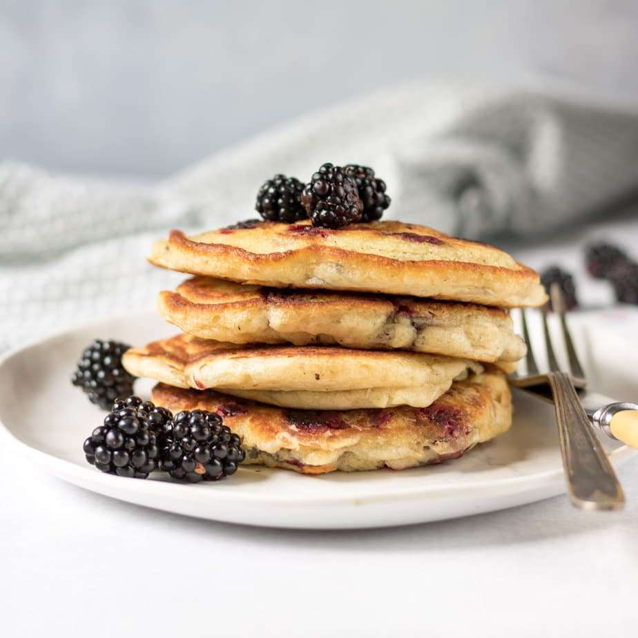 You'll love these homemade fluffy Blackberry Pancakes! They're full of summer flavor from the juicy berries and you can use fresh or frozen in this super easy 15-minute recipe.