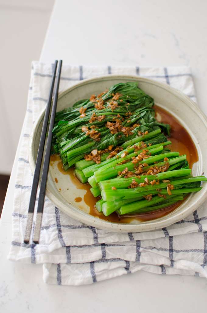 - Remove the skillet from the heat and pour the sauce over choy sum. Serve warm.