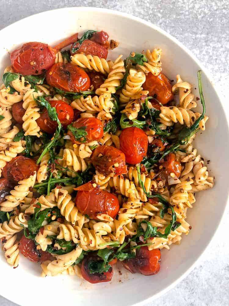 Quick and easy pasta with blistered tomatoes, arugula, garlic, and gluten free pasta.