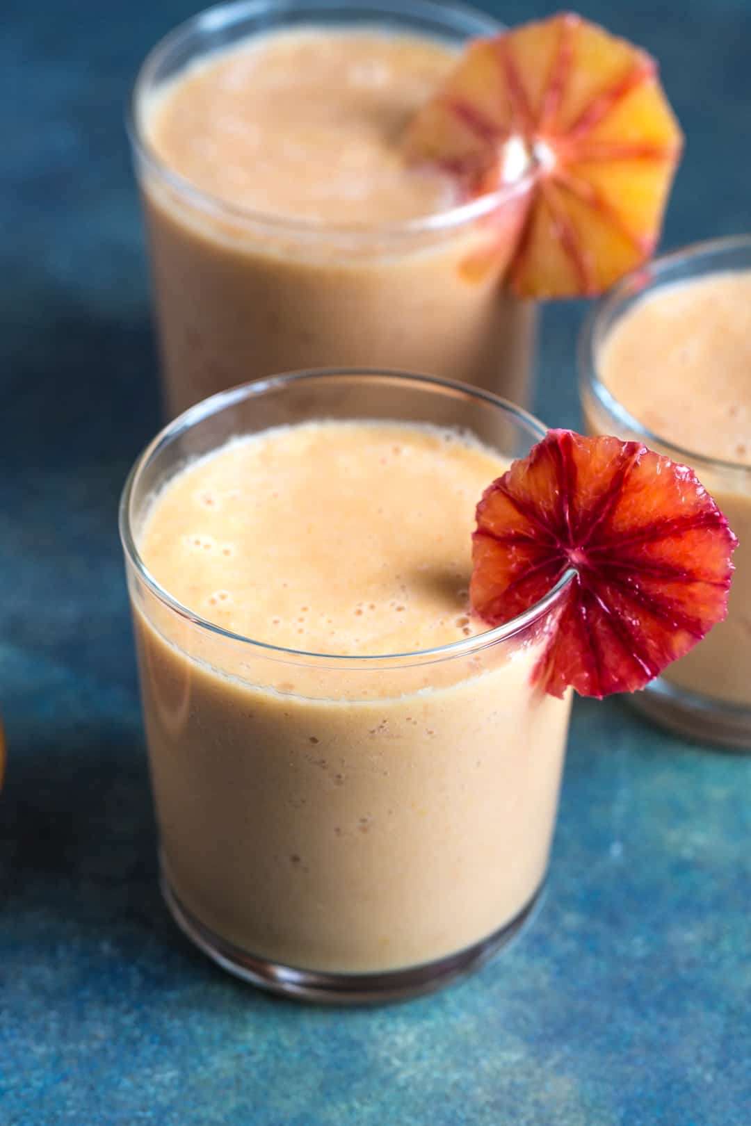 - Mix all ingredients in a high powered blender and garnish with blood orange slices.