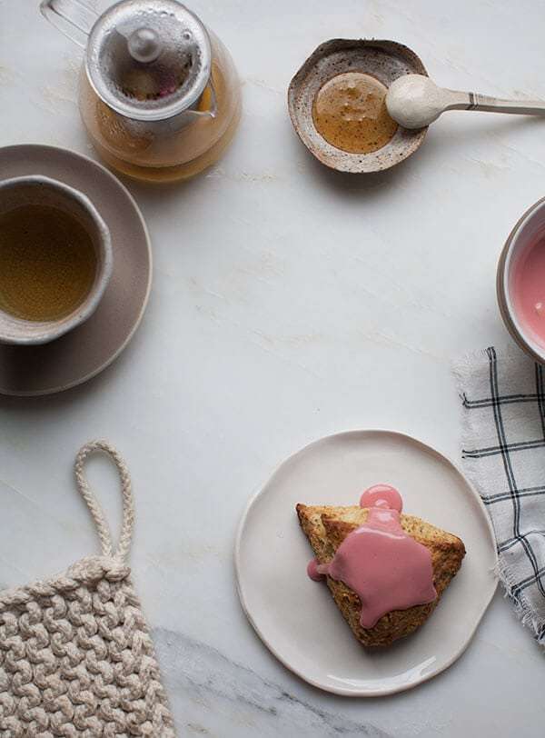 - While the scones are baking, make the glaze. In a small bowl, whisk the powdered sugar with the juice from the one blood orange. Since all blood oranges are a different size (I got about 1 tablespoon of blood orange juice) you may need to add a bit more juice or a splash of milk to get it to the right texture.