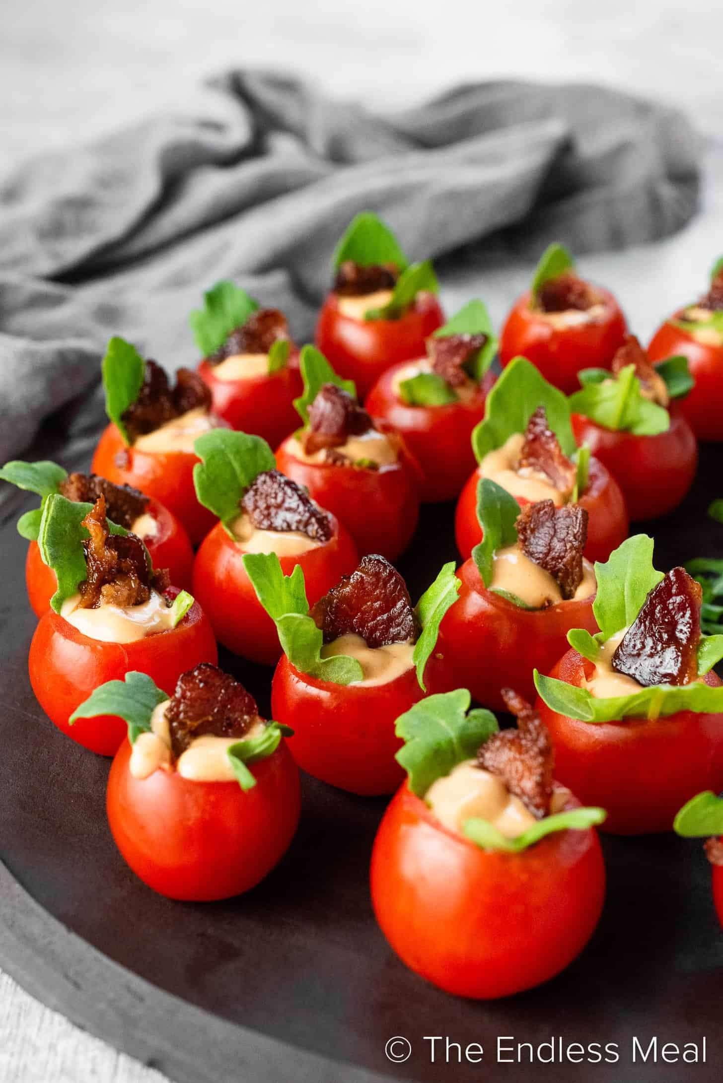 - Tuck a piece of arugula into each cherry tomato. Spoon a little of the crumbled bacon inside then fill with the chipotle mayo and top with a piece of bacon.