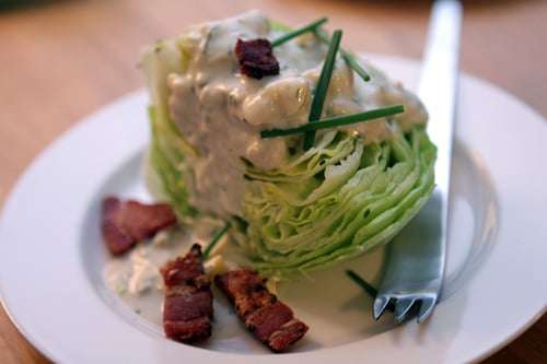 - Serving: Spoon over wedges of very cold Iceberg lettuce or use as a dip. Garnish with additional chives, crumbled or sliced bacon, and some freshly ground black pepper. Storage: Blue cheese dressing can be made up to three days ahead and refrigerated.