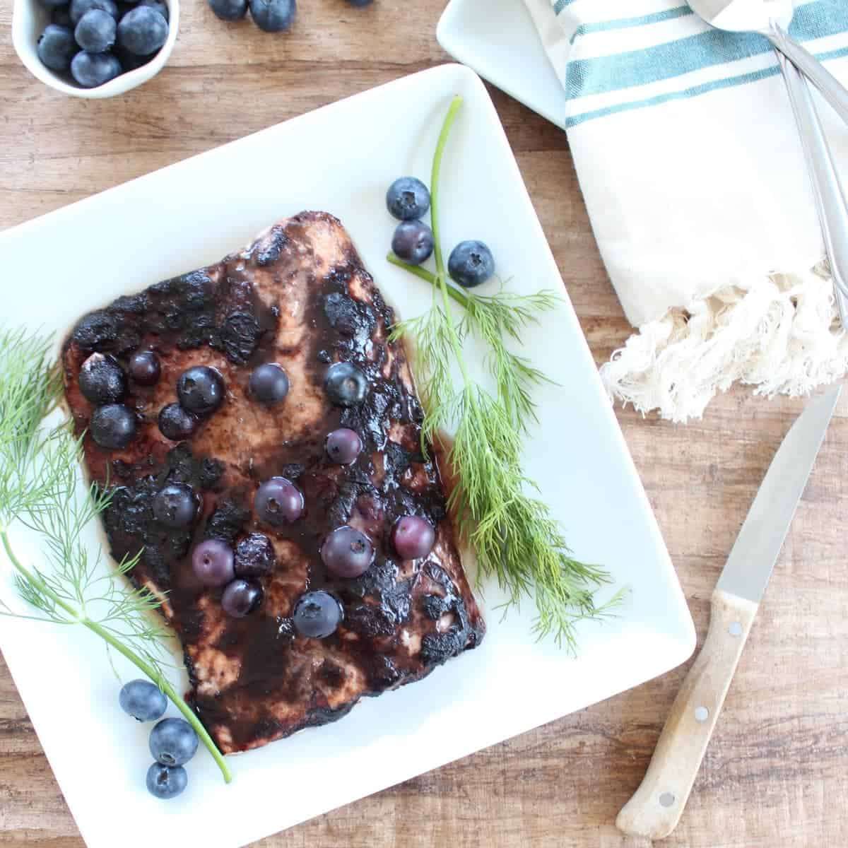 Fresh Grilled Salmon is smothered in Homemade Blueberry BBQ Sauce made with only 4 ingredients for a simple, healthy, gluten free recipe!