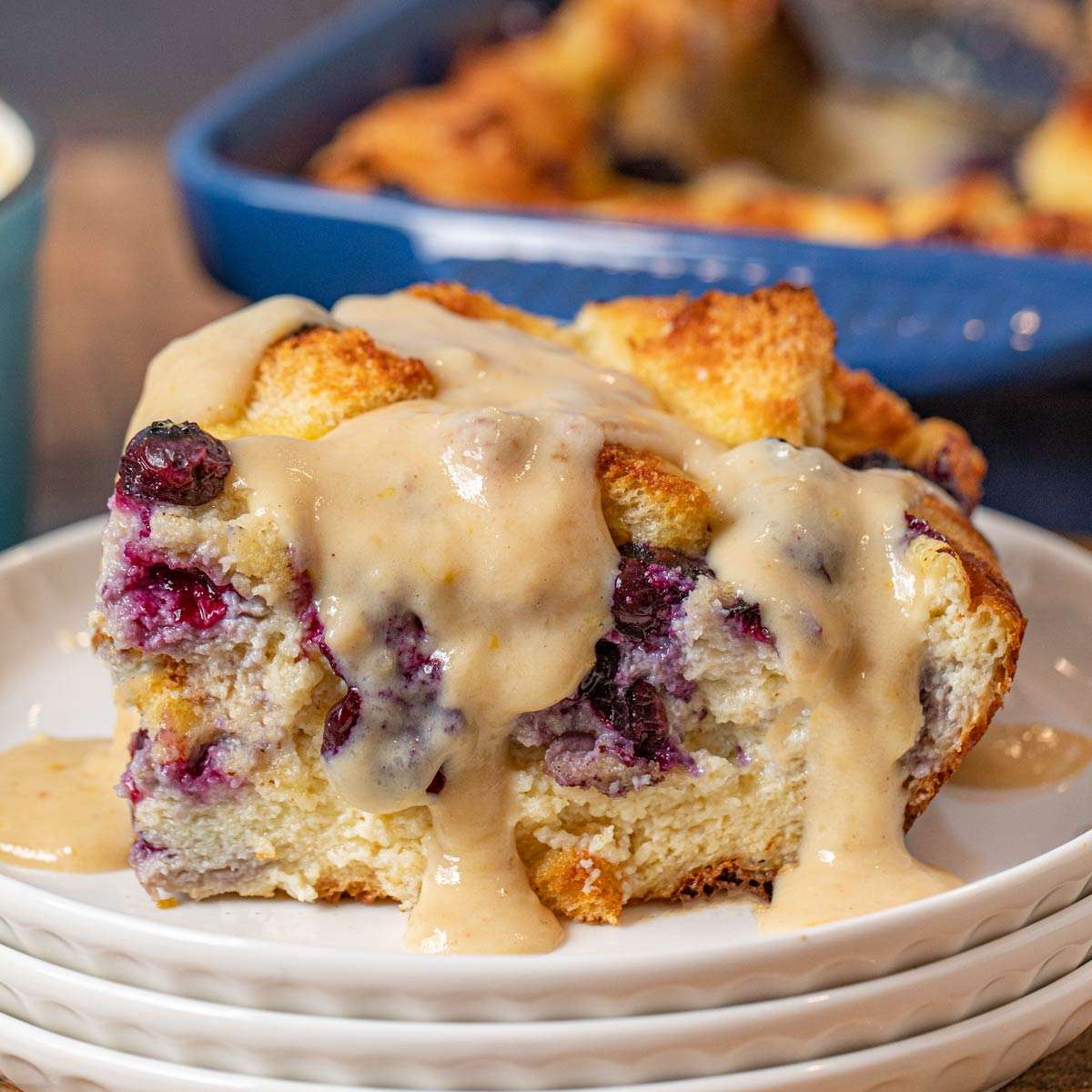 Blueberry Bread Pudding mixes sweet and tender, buttery bread with fresh, juicy blueberries topped off with a tart lemon and vanilla glaze.